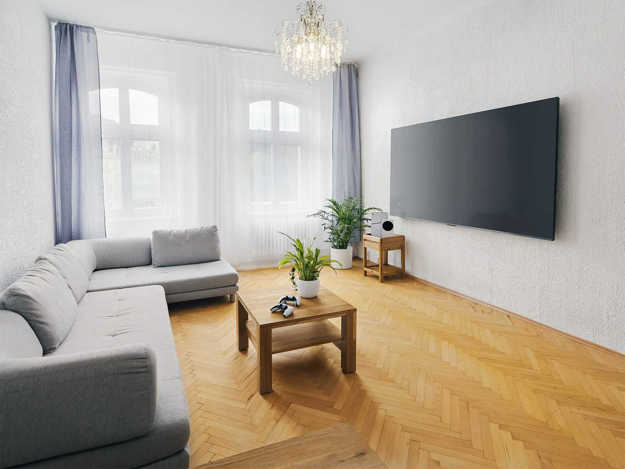 Velký apartmán se dvěma ložnicemi ve 3. patře, kam vede výtah do mezipodlaží, je ideální pro rodinu nebo skupinu hostů, kteří ocení prostor a pohodlí. Byt má nádherný výhled na park s Alžbětinými lázněmi, centrum města a řeku. Zaujme původními parketami, vysokými stropy a masivním nábytkem. Obývací pokoj nabízí velkou sedací soupravu a obrovskou 100" televizi s PlayStationem i Xboxem pro společné chvíle i zábavu. Obě ložnice mají manželské postele s možností přípravy oddělených lůžek, každá s vlastní televizí. Kuchyně, koupelna a WC jsou zachovány dle požadavku majitele, přesto dbáme na maximální čistotu. V koupelně nechybí sprcha ani pračka se sušičkou.